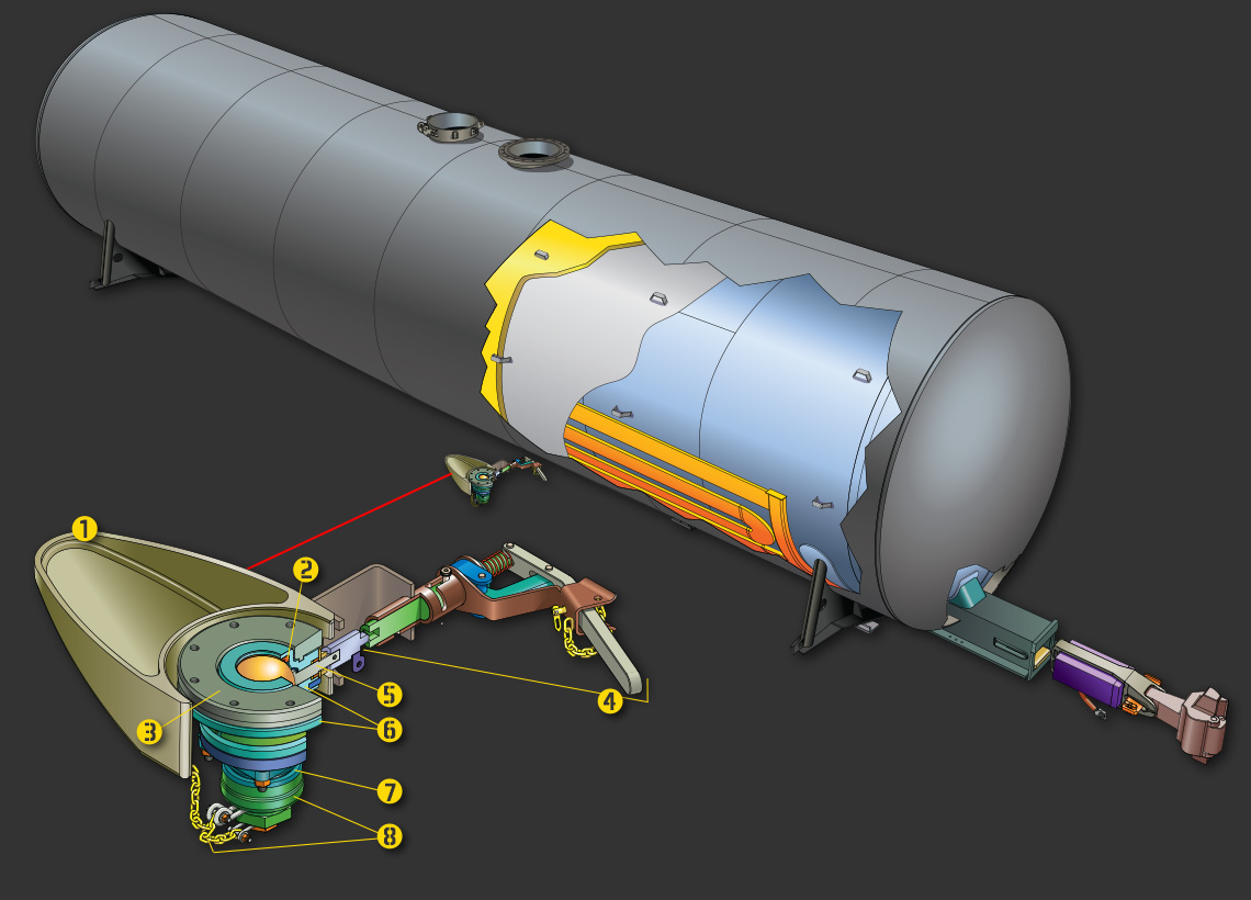 The valve body is engineered for a tongue-and-groove match with a steel saddle that is welded to the tank shell. The low profile design results in the valve being slightly recessed into the tank saddle and skid arrangement, but still flush with the tank shell to allow unloading. The protection is fortified with a skid that is welded to the tank shell. The skid shear point protects the valve bodies. This robust system averts commodity loss by allowing the nozzle and secondary valves to shear away in the event the tank separates from the truck during an incident.