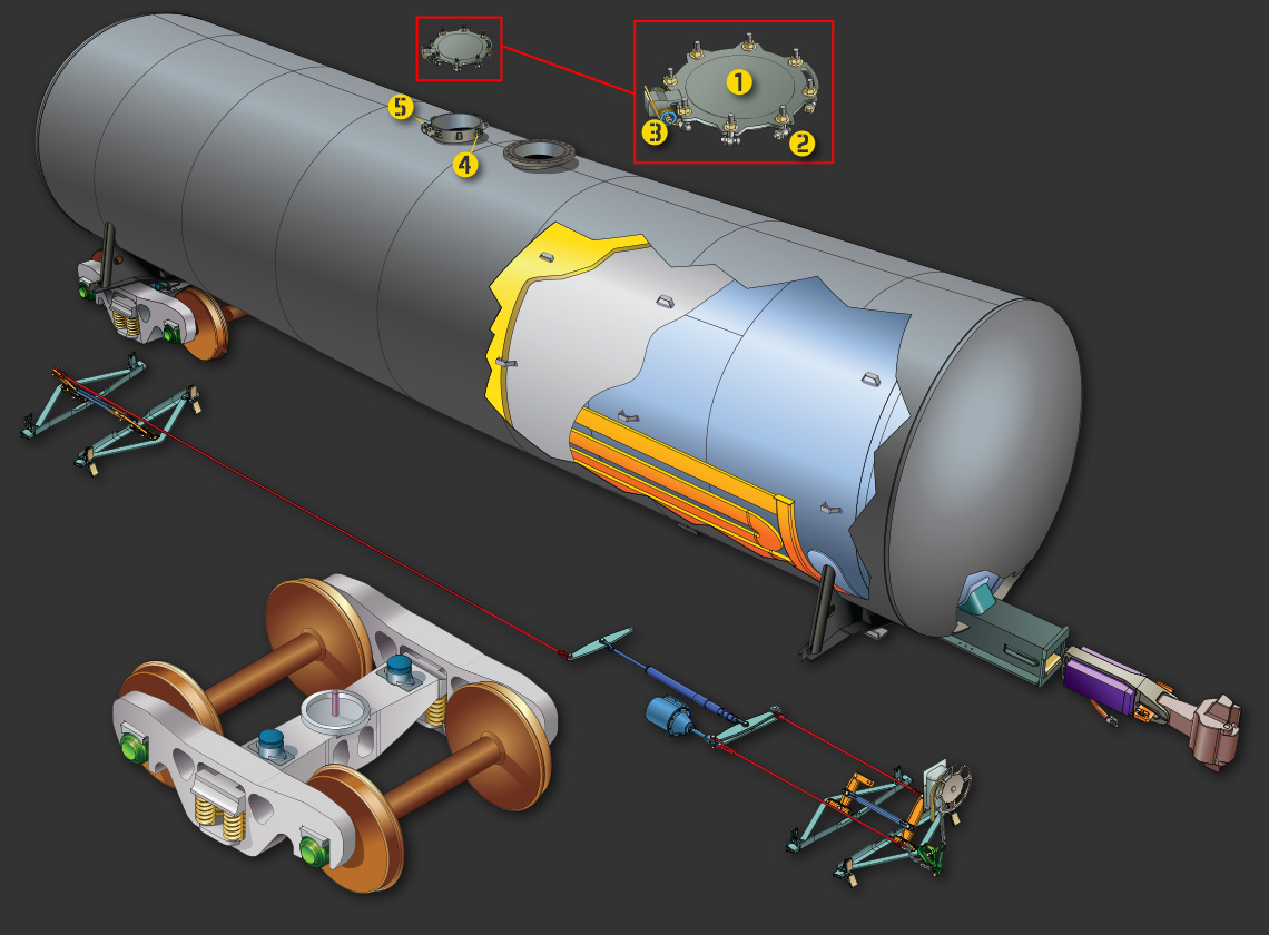 The UTLX DOT117A100W tank car is equipped with a 20" I.D. inserted manway to allow easy entry into the tank when required. The normalized steel nozzle is fusion-welded to the tank shell for safety, strength, rigidity and long performance. The UTLX manway nozzle features eight fabricated lugs to ensure tight and even clamping pressures are achieved on the gasket between the manway nozzle ring and the manway cover. Also fusion-welded to the nozzle ring is the one-piece hinge lug, which accepts the UTLX AAR-1 Style manway cover assembly with E-Z Lift™ spring assisted opening.